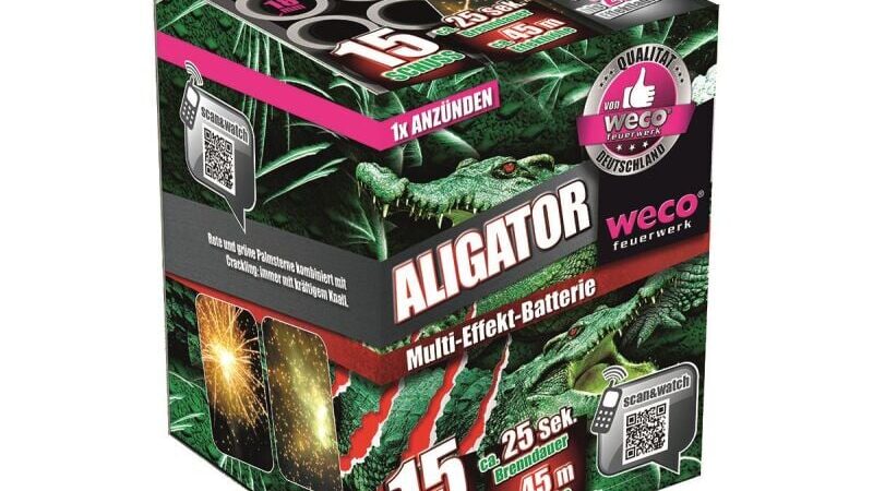 Kompakte 15-Schuss Batterie mit Goldpalmen und Crackling Die Aligator-Batterie liefert 15 kraftvolle Schüsse mit Goldpalmen-Effekten und intensivem Crackling . Eine solide Feuerwerksbatterie für alle, die auf klassische Effekte mit starker Wirkung setzen. 15 Schuss mit gleichmäßiger Effektfolge Goldpalmen kombiniert mit kräftigem Crackling Attraktiver Preis für viel Effekt pro Euro Ein Klassiker für die Silvesternacht – laut, goldglänzend und zuverlässig.
