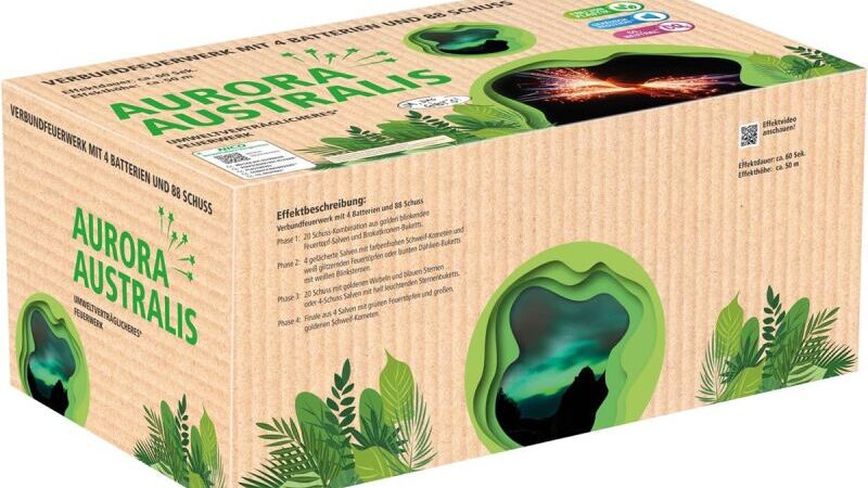 Erlebt das Spektakel der AURORA AUSTRALIS in der eigenen Nachbarschaft! Mit diesem Verbundfeuerwerk holt ihr die Magie der Südlichter (auch Aurora Australis genannt) direkt nach Hause. Genießen Sie das farbenfrohe Schauspiel und verwandeln Sie Ihre Silvester-Party in ein einzigartiges Lichtermeer aus Licht und Feuerwerk! Verbundfeuerwerk mit 4 Batterien und 88 Schuss Phase 1: 20 Schuss-Kombination aus golden blinkenden Feuertopf-Salven und Brokatkronen-Buketts. Phase 2: 4 gefächerte Salven mit farbenfrohen Schweif-Kometen und weiß glitzernden Feuertöpfen oder bunten Dahlien-Buketts mit weißen Blinksternen. Phase 3: 20 Schuss mit goldenen Wirbeln und blauen Sternen oder 4-Schuss Salven mit hell leuchtenden Sternenbuketts. Phase 4: Finale aus 4 Salven mit grünen Feuertöpfen und großen, goldenen Schweif-Kometen.