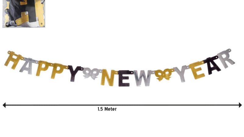Buchstaben-Girlande mit goldenen, silbernen und schwarzen Buchstaben: „Happy New Year“