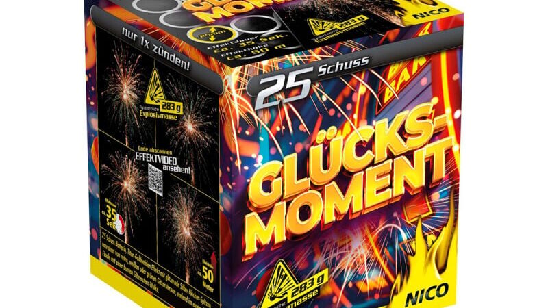 GLÜCKSMOMENT – Der Himmel voller Magie! Spüre die Spannung, als würdest du am Roulette-Tisch stehen – Glücksmoment bringt das Casino-Feeling direkt in den Nachthimmel. Mit 25 Schüssen voller Glanz und Glamour wird jede Nacht zum Gewinn: Goldener Hauptgewinn: Titan-Goldweiden erstrahlen wie ein glänzender Jackpot und werden von funkelnden Silber-Flocken-Spitzen gekrönt. Spiel der Farben: Rote, weiße und grüne Glitzersterne mischen sich in die Szenerie und verleihen der Show einen Hauch von Las Vegas. Das große Finale: Eine 5-Schuss-Salve entfaltet eine spektakuläre, bunte Glitzerstern-Wolke – das perfekte Ass im Ärmel!