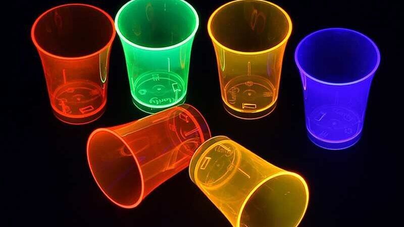 Der neue Partyhit: UV Licht / Schwarzlicht Becher! Diese Becher in Neonfarben leuchten unter UV-/ Schwarzlicht. Sie bestehen aus Plastik (Polystyrol) und sind spülmaschinenfest und daher wiederverwendbar. Dieser Becher ist 5,8 cm hoch und hat ein Fassungsvermögen von 50 ml. Im Lieferumfang ist enthalten: 8 UV Schnaps Becher 50 ml in verschiedenen Farben (blau, grün, orange oder rot)