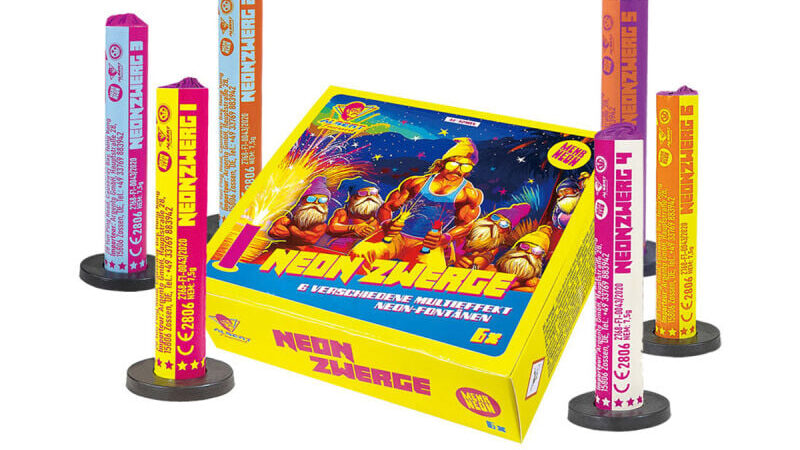 6 verschiedene Multieffekt-Neon-Fontänen: Grünblinker mit Neonsternen in Lemon und Pink Silberchrysanthemen mit Neonsternen in Aqua und Orange Goldchrysanthemen mit Neonsternen in Aqua und Pink Weißblinker mit NeonSternen in Lemon, Aqua und Pink Goldfunken-Knallsterne mit NeonSternen in Aqua, Orange und Purpur Silberfunken-Knallsterne mit NeonSternen in Pink, Orange und Lemon